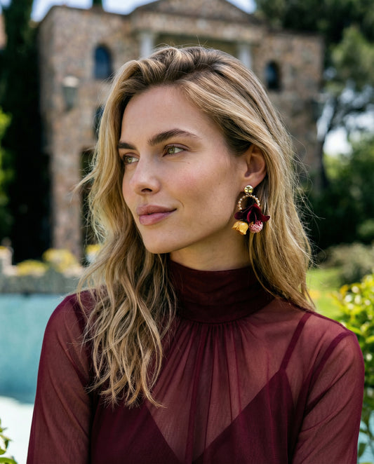 Pendientes Flores naturales con cristales mostaza y granate