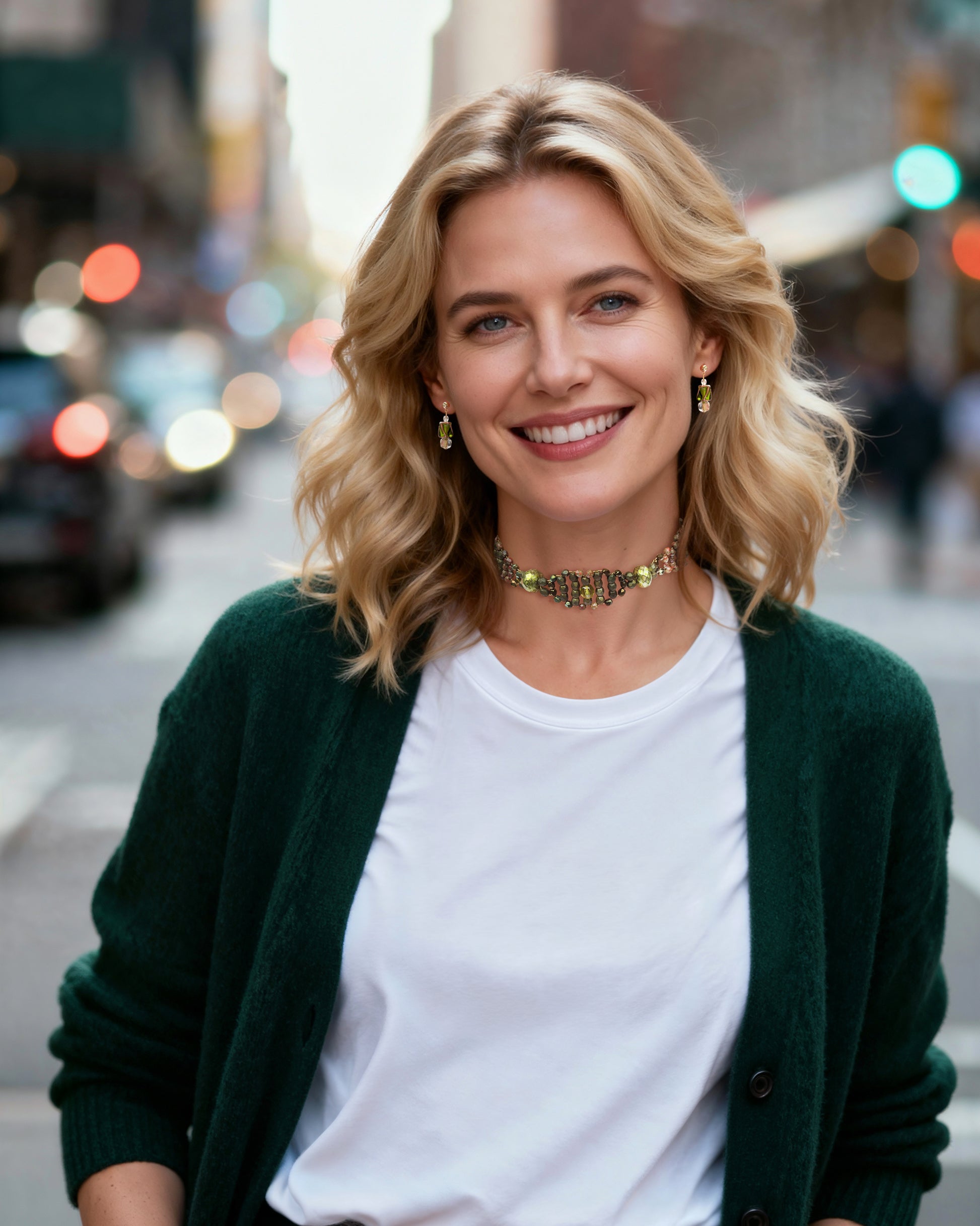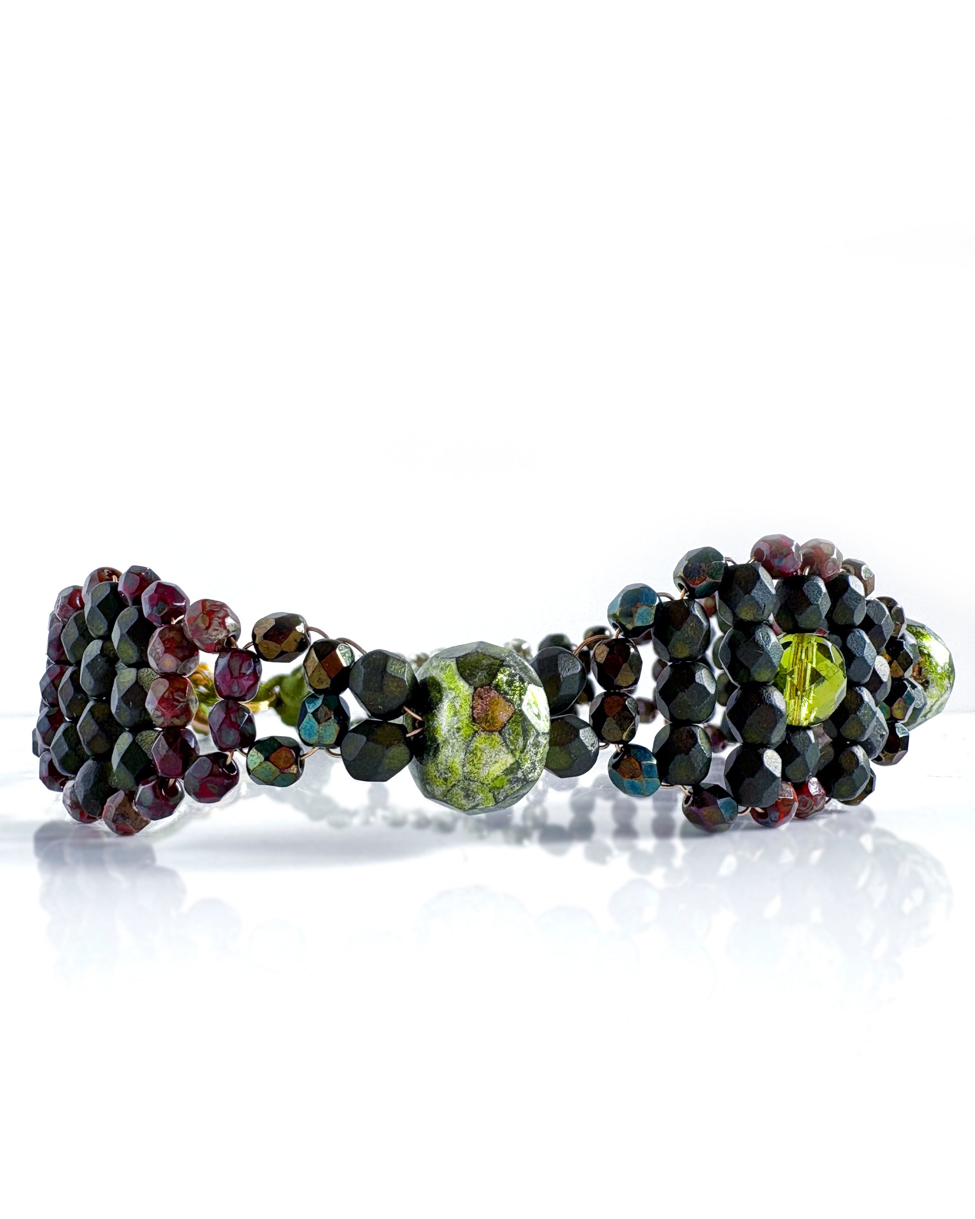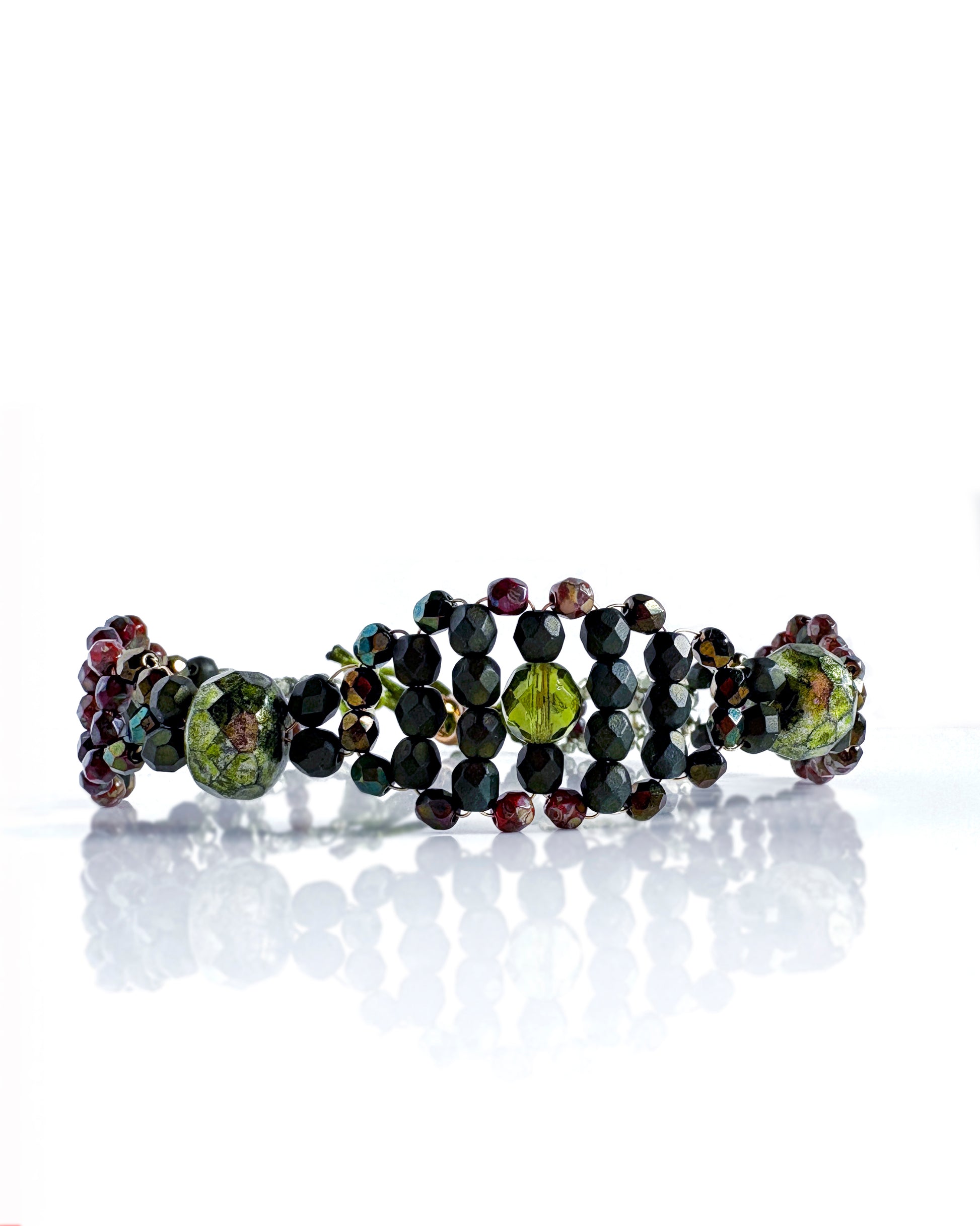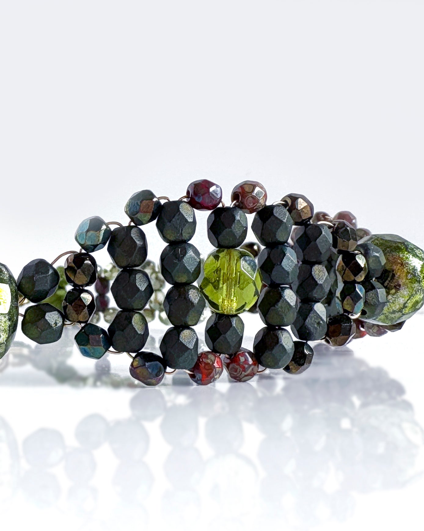 A 3cm-wide choker made with sparkling green crystals of various sizes and shades. A mosaic of emerald green crystals surrounds the center. Spectacular. It closes with an adjustable silk ribbon.