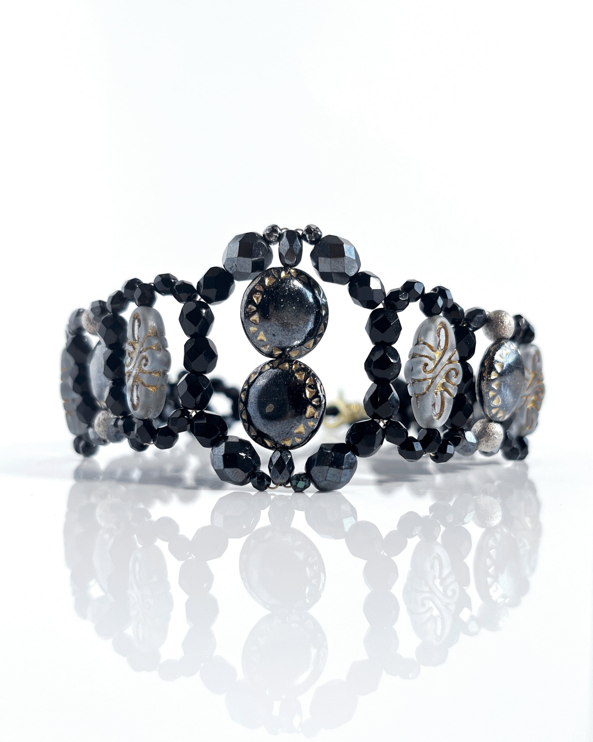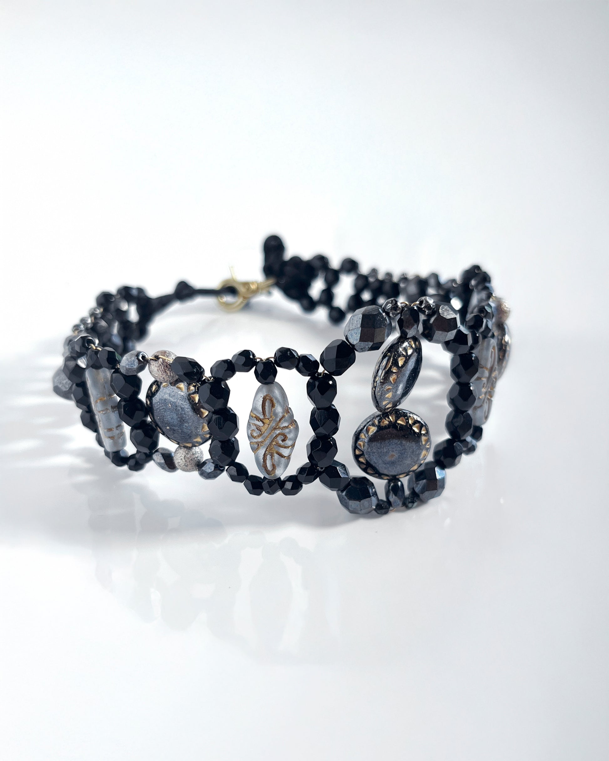 This choker from the CALA EMPERATRIZ collection stands out for its stunning design featuring round, glossy black glass pieces, enhanced with gold details. The gray and gold crystals add a sophisticated and elegant touch that elevates any look.