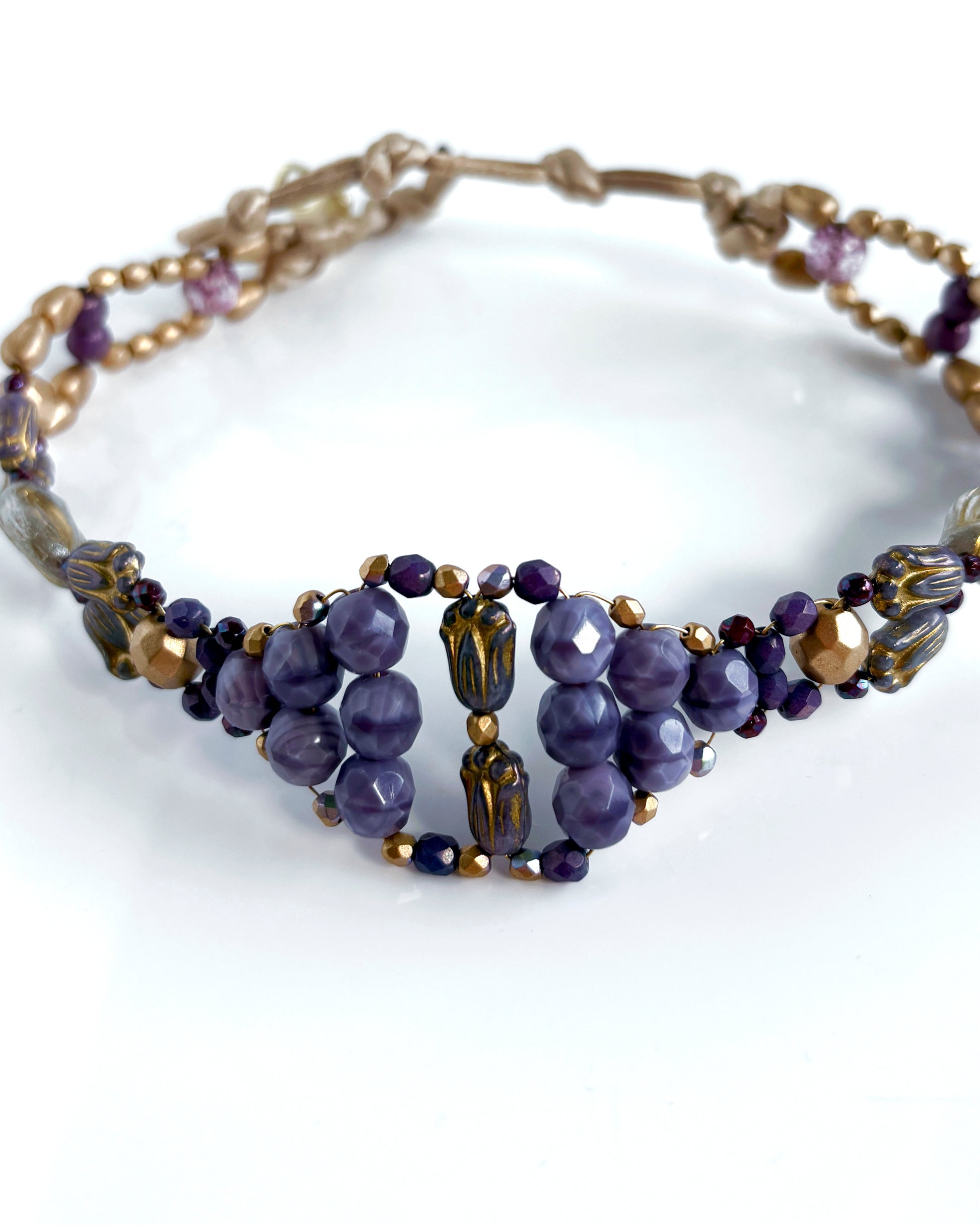 This choker, inspired by Tuscany's Petraia Palace, combines the delicacy of lilac glass tulips with golden crystals for a design that radiates elegance and sophistication. Ideal for guests. Adjustable.