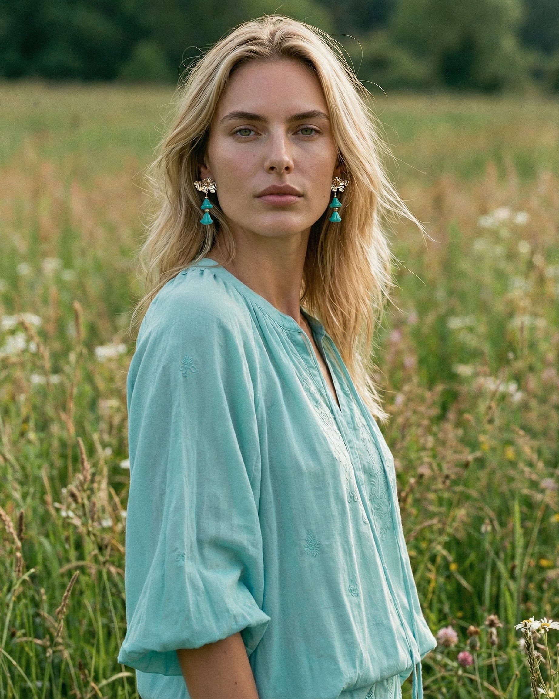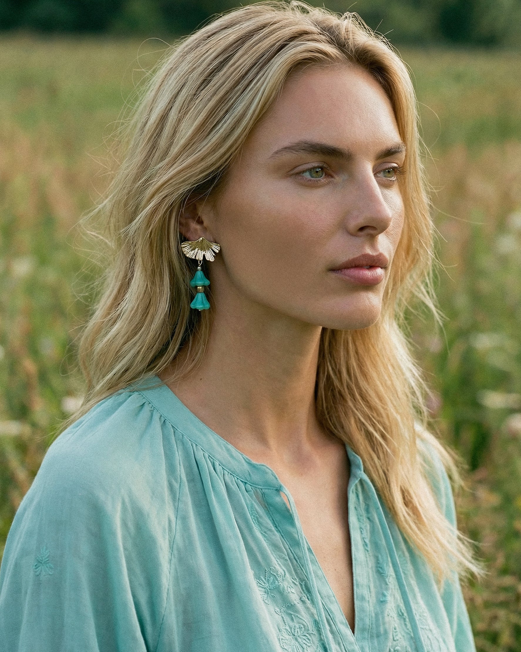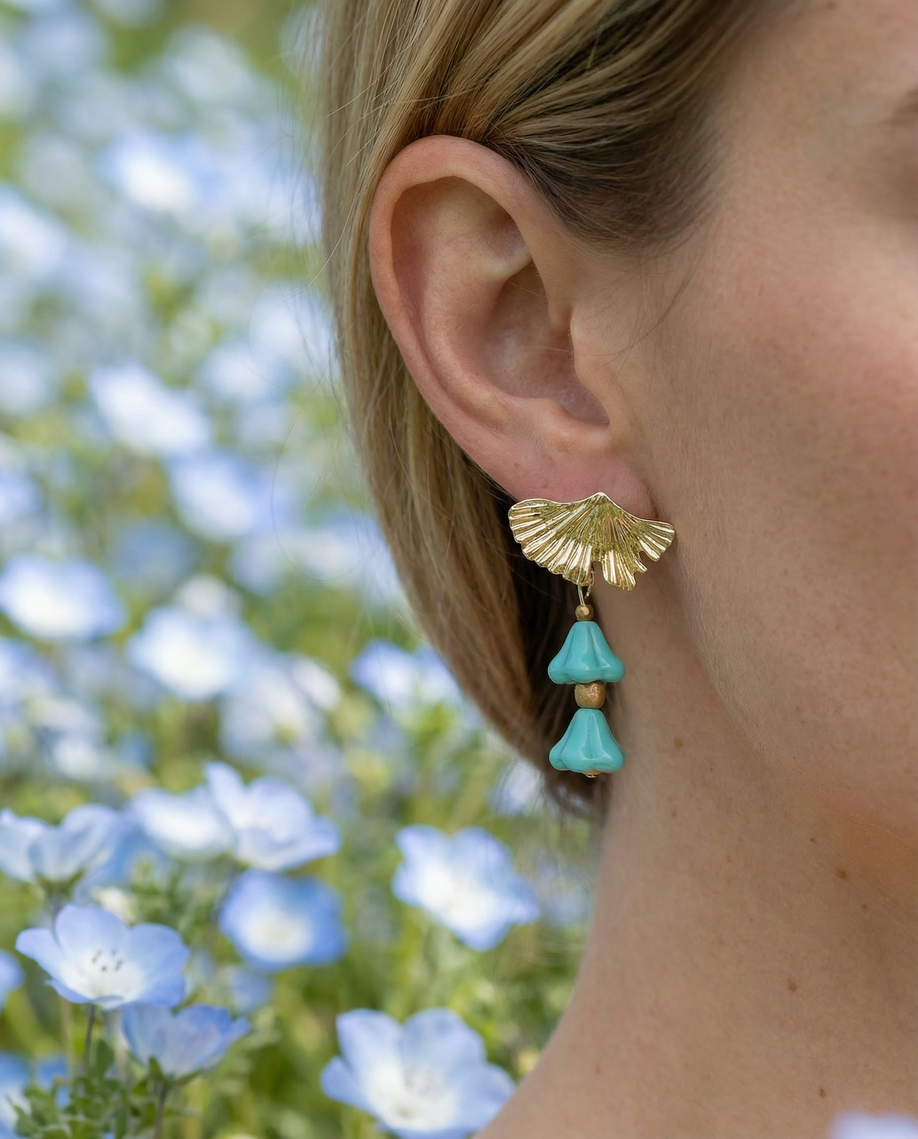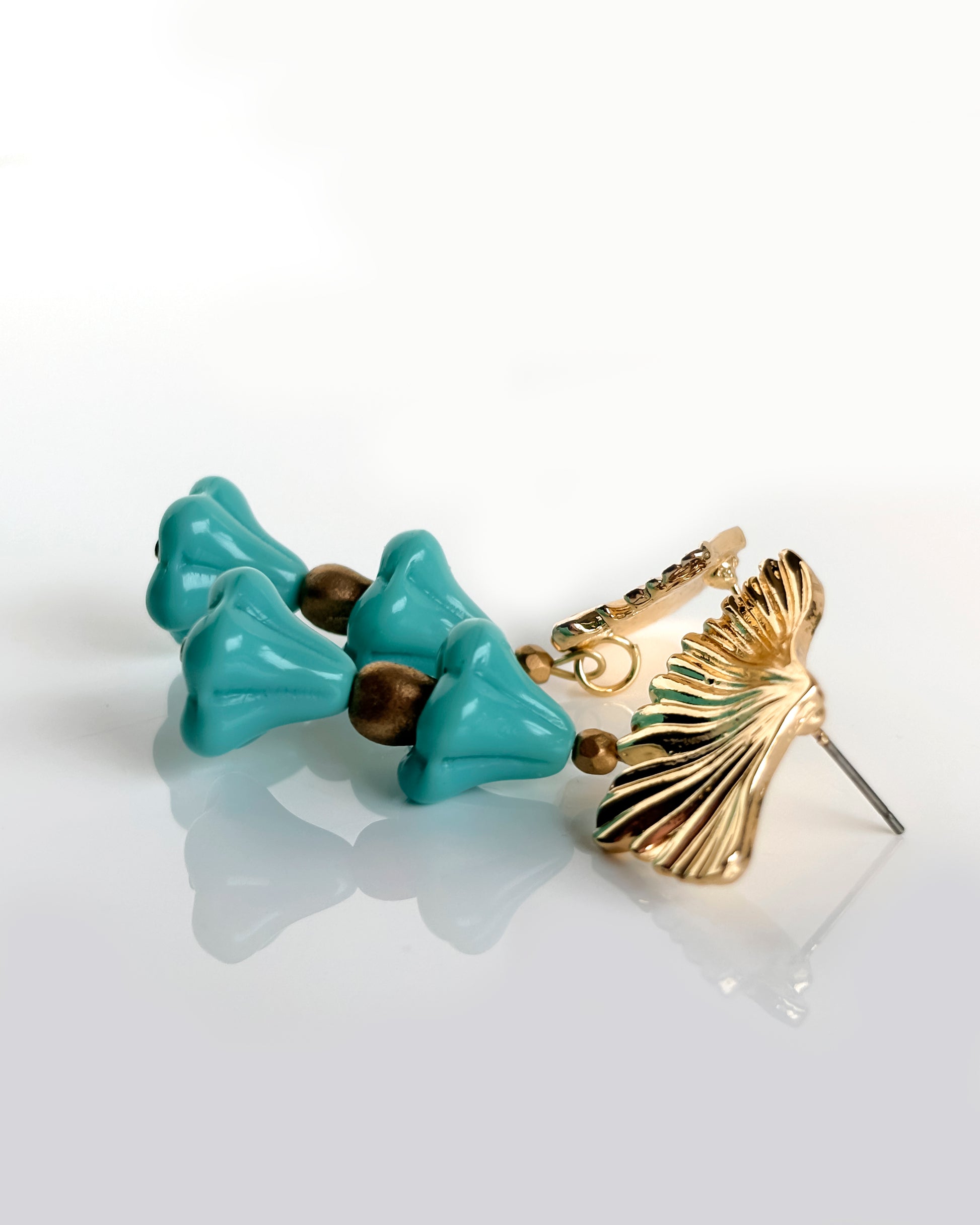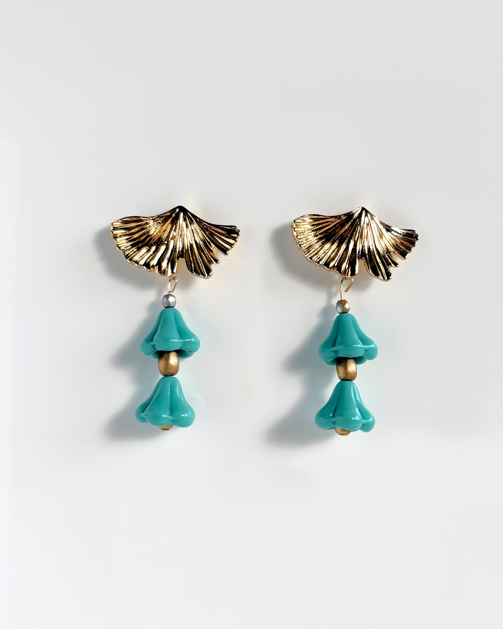 Pendientes con cristales turquesas en forma de flor que brillan con cada movimiento. El cierre dorado diseñado como una hoja de ginkgo les da un toque muy original y diferente.