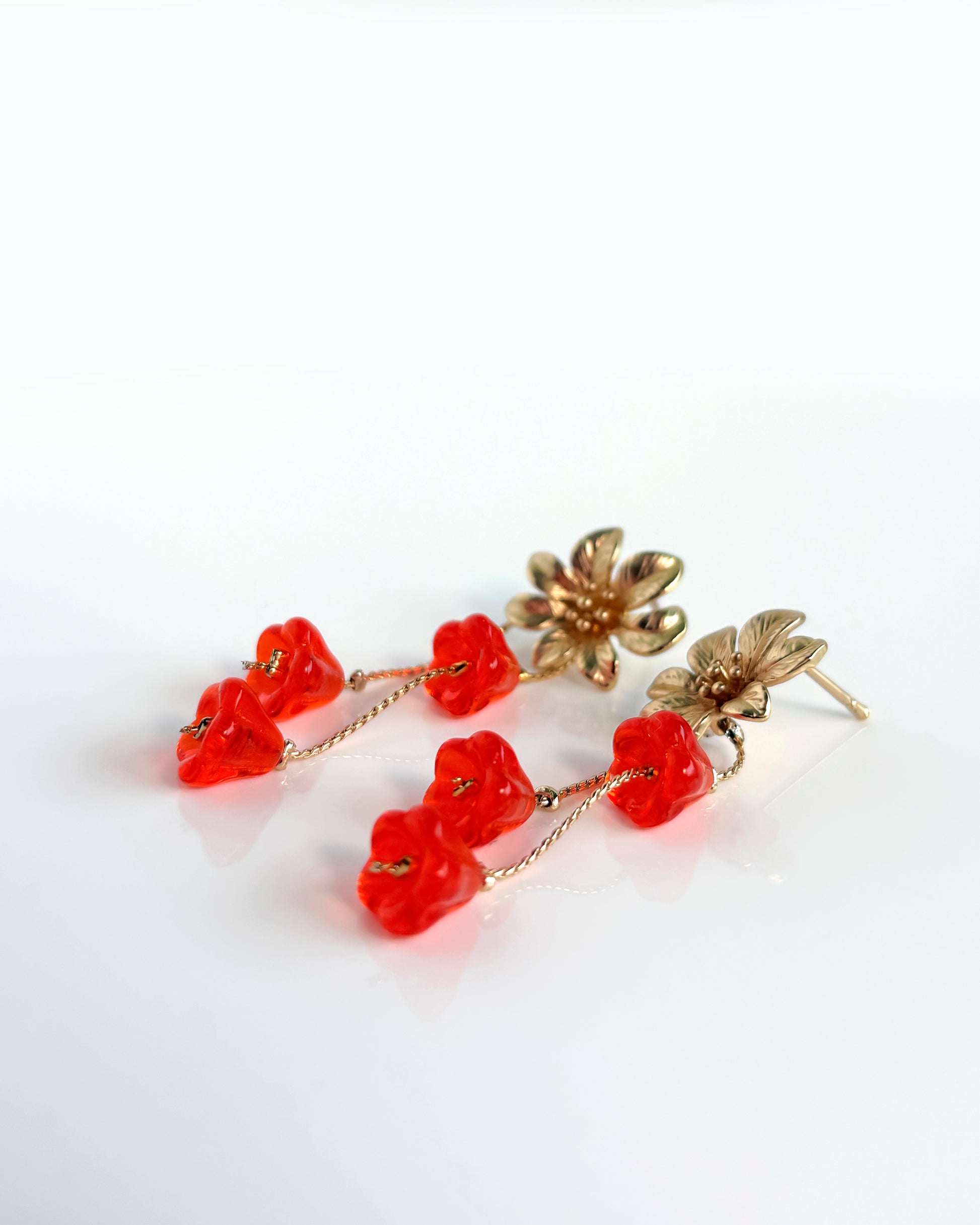 Cierre en forma de flor dorada que sostienen una delicada cadena de oro con pequeñas flores de cristal naranja.