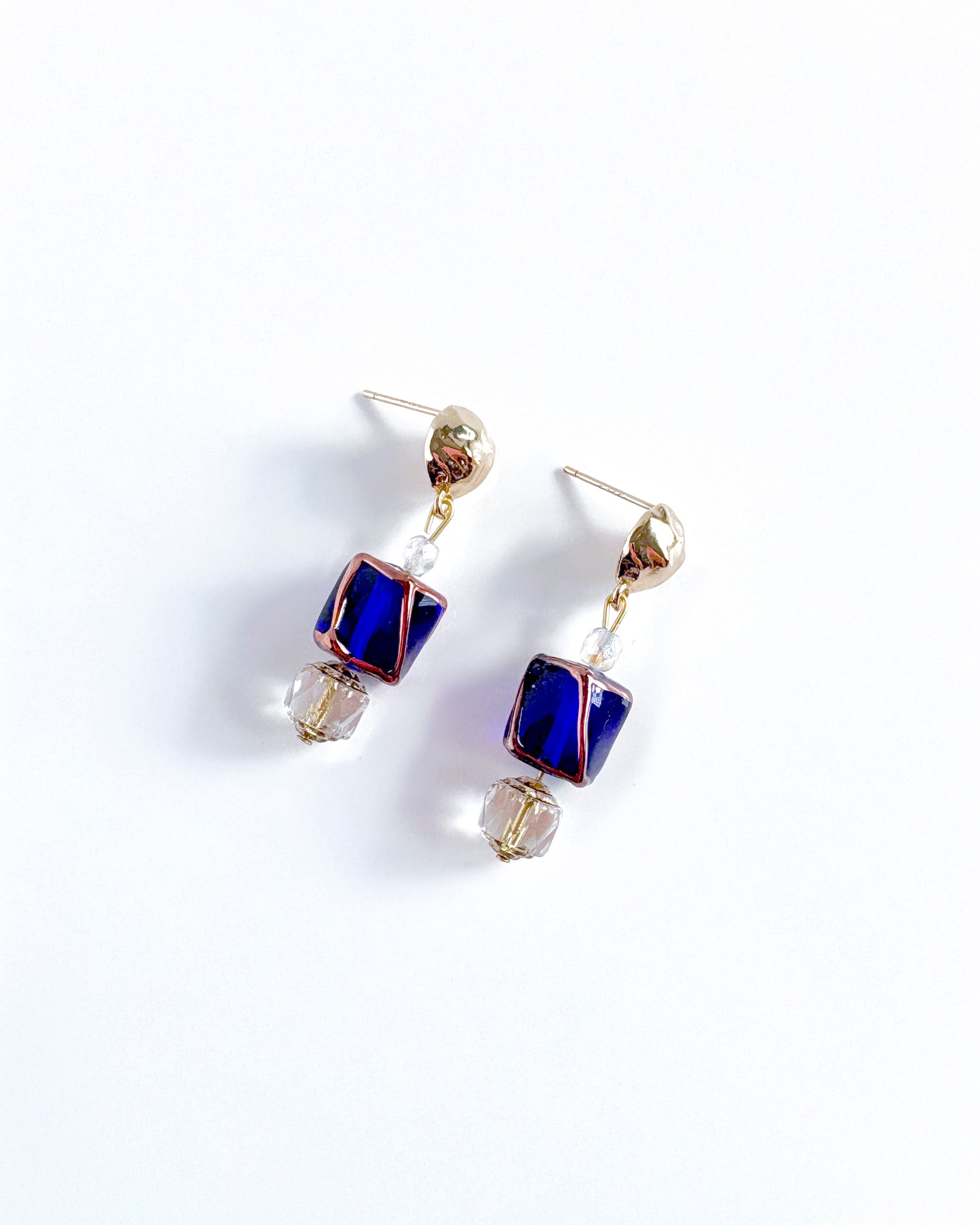 These earrings stand out for their elegant and simple design, which combines a blue and gold crystal cube with a sparkling clear crystal, creating a harmonious light contrast. Lightweight and delicate, they're ideal for all-day wear without sacrificing comfort. Their versatility makes them the perfect accessory for any occasion, from a workday to a special outing.