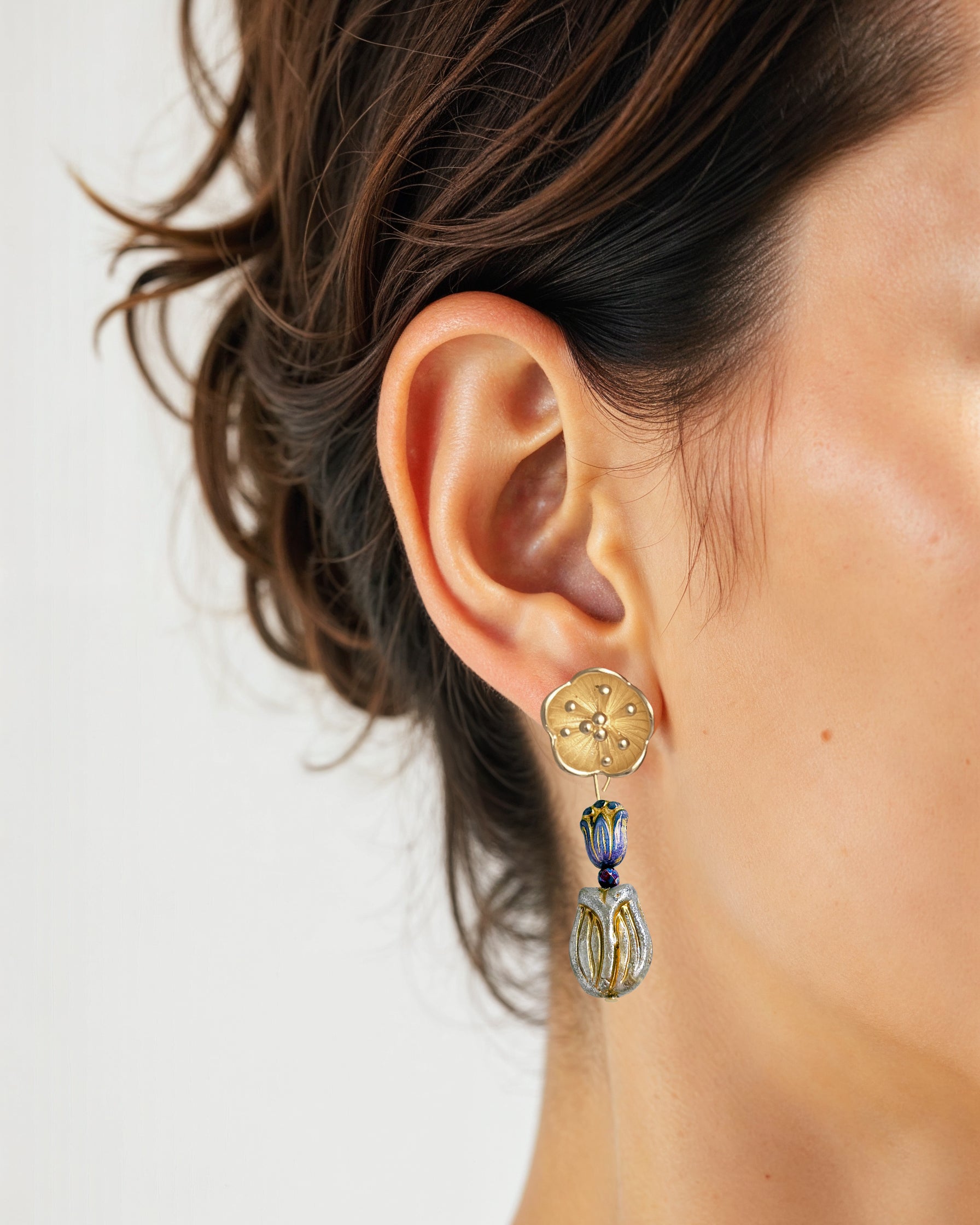 Inspired by Tuscany's Petraia Palace, these earrings combine the delicacy of lilac glass tulips with golden crystals. They feature a matte gold flower-shaped closure. Lightweight.