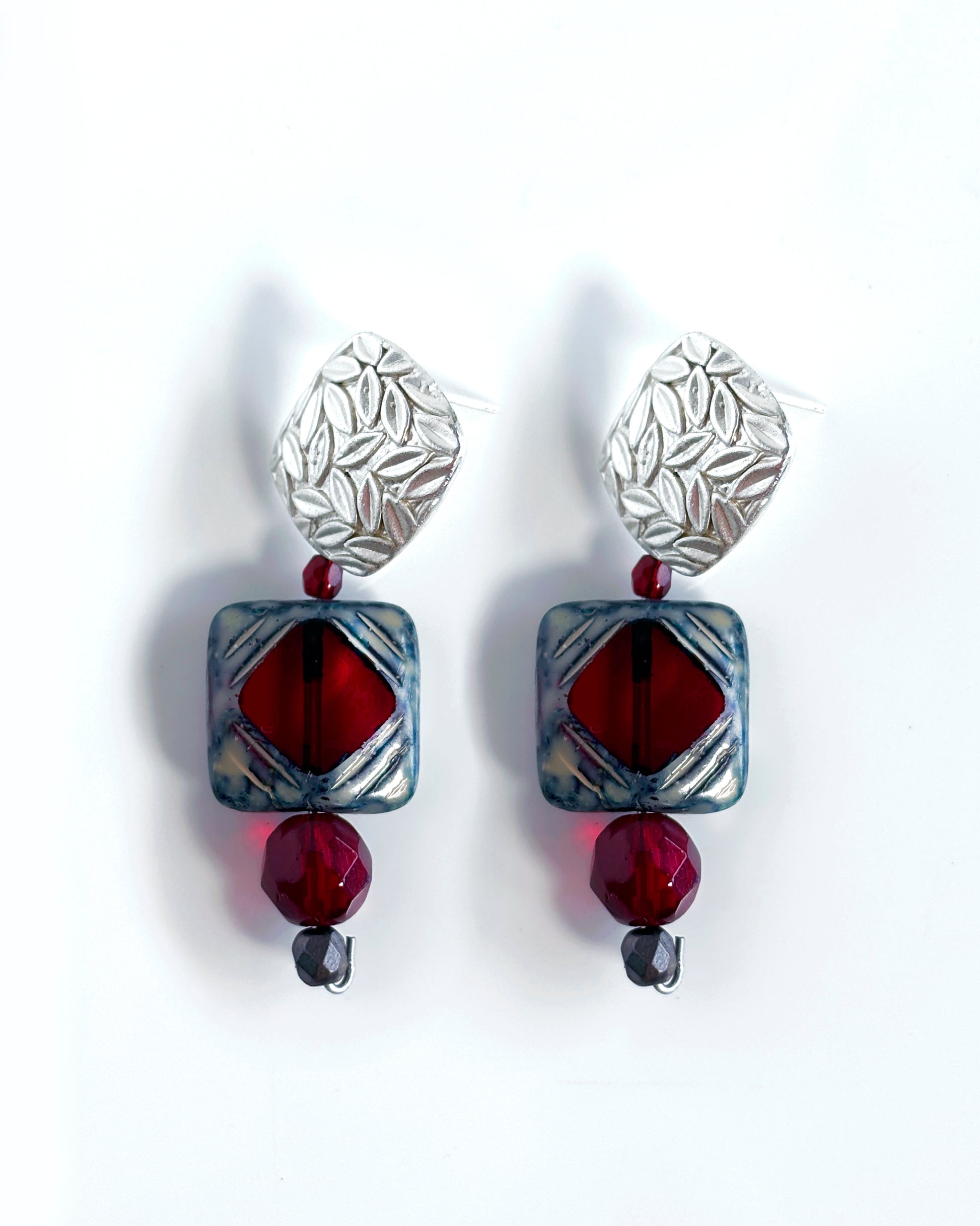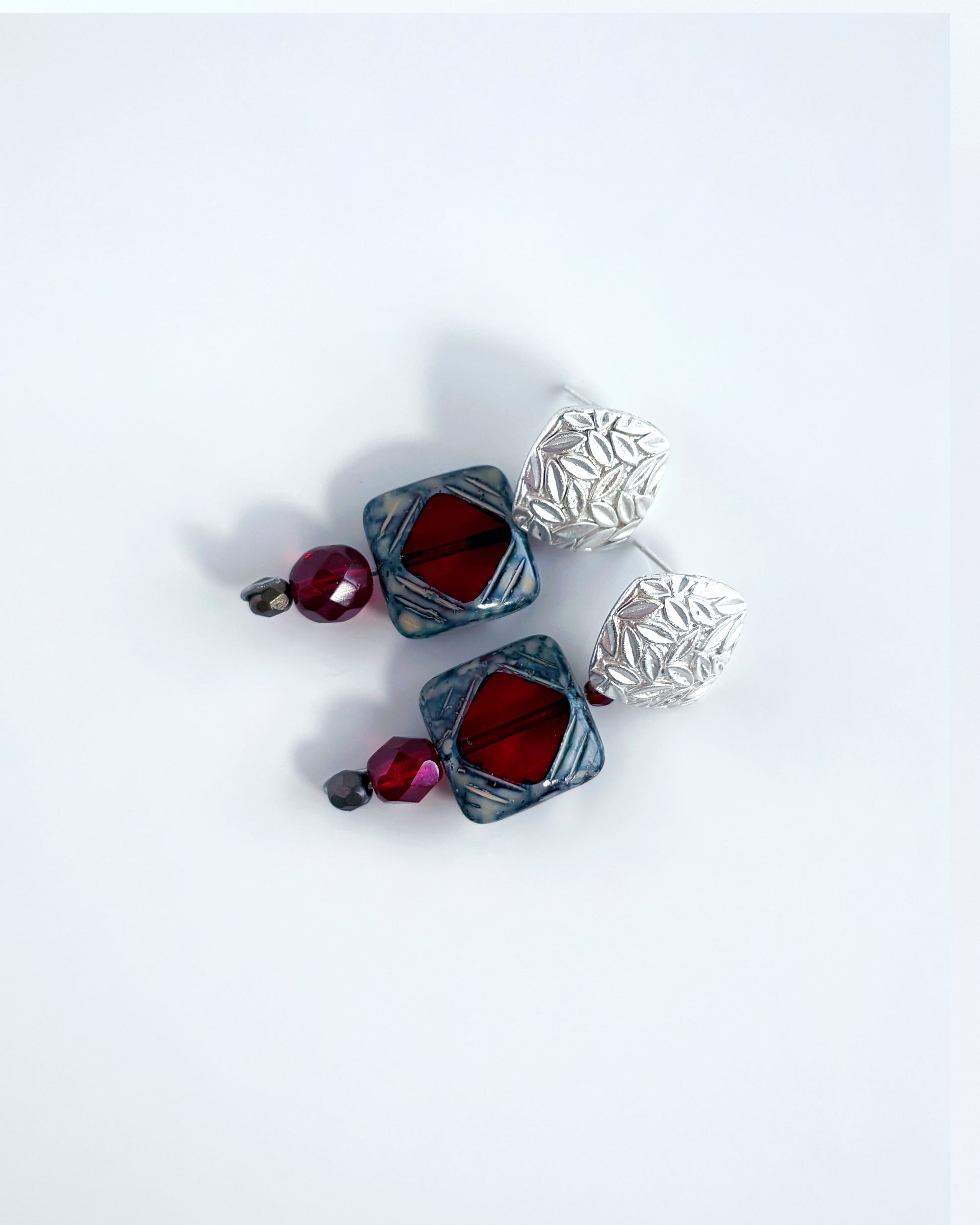 Earrings made with garnet-colored crystals. A large, square crystal draws attention with its brilliance and intense color.