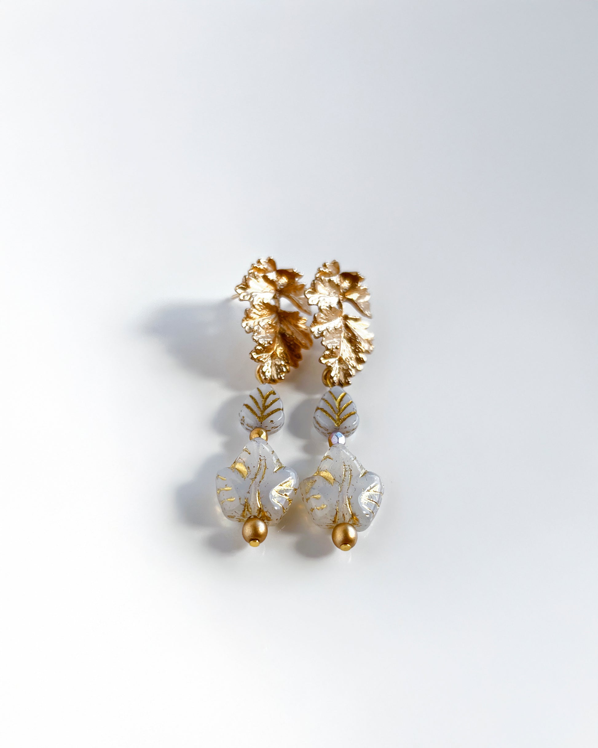 These gold earrings from the CALA EMPERATRIZ collection are inspired by the majesty of the Palace of Versailles. Featuring a leaf-shaped clasp and delicately cut glass, also shaped like leaves, they add an elegant and sophisticated touch. Perfect for guests who want to shine with style.
