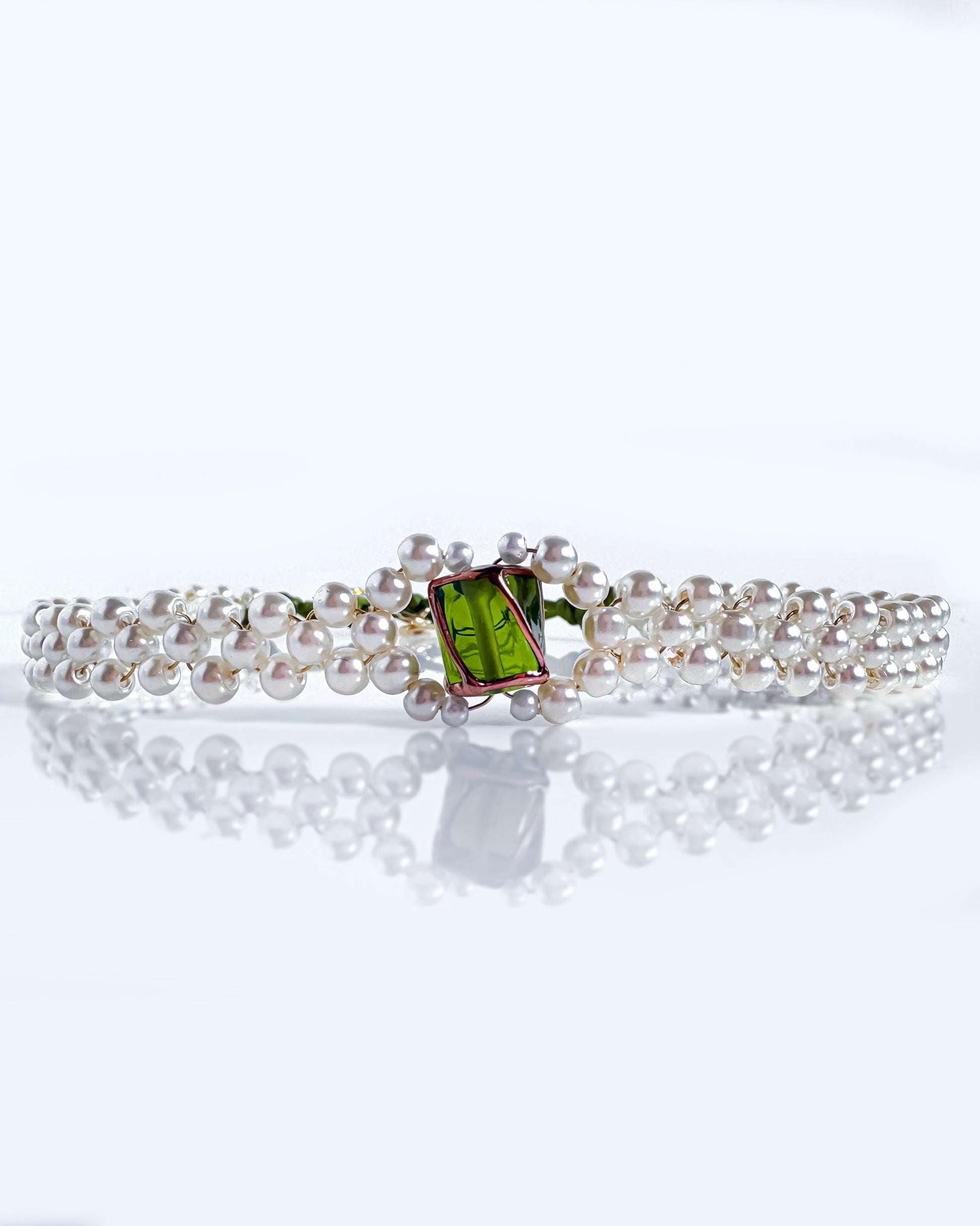 Súper favorecedor, elegante, sutil a la vez que sofisticado. Un choker que no dejarás de ponértelo. Realizado con perlas de cristal y un vidrio en forma de cubo de un color verde oliva precioso en el centro.